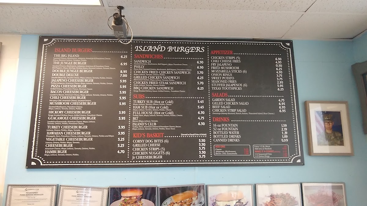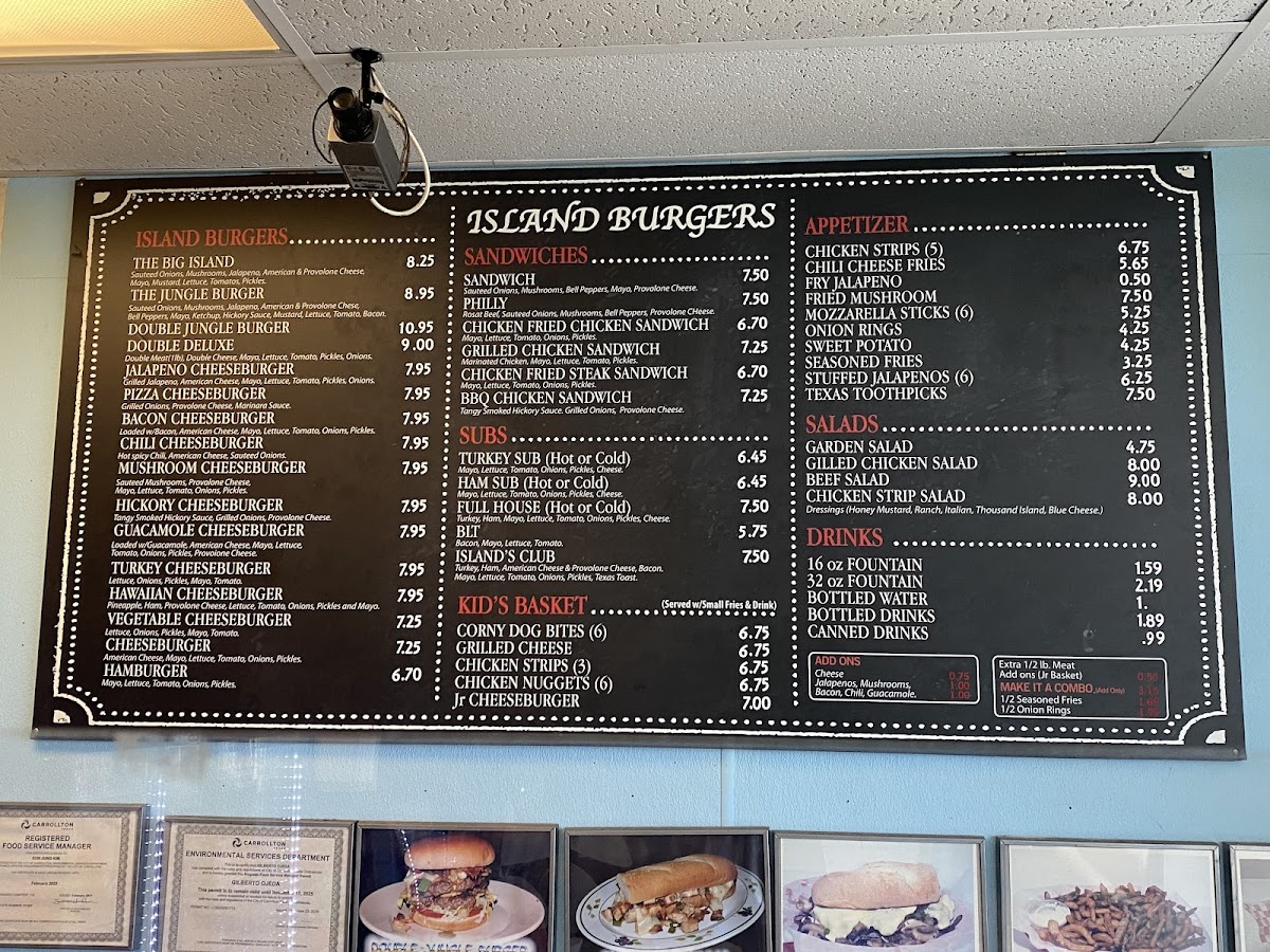 Welcome to Burger Island - Carrollton, a haven for burger lovers located at 1208 E Belt Line Rd #108. This vibrant eatery serves a tempting array of island-inspired burgers that are sure to delight your taste buds. The menu features the iconic Big Island Burger, crowned with sautéed onions, mushrooms, and a blend of American and provolone cheeses, all for just $7.25. For those seeking a flavor explosion, the Jungle Burger includes bacon and a robust hickory sauce, priced at $7.95.